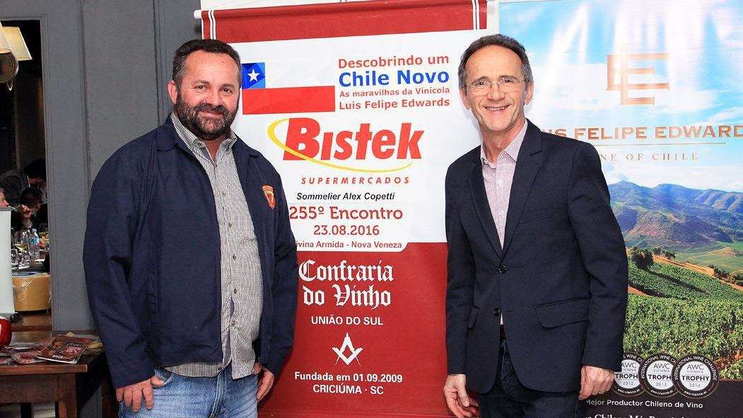 A rede Bistek de supermercados, vinícola chilena Luis Felipe Edwards e o famoso restaurante neoveneziano Divina Armida foram os grandes responsáveis pela harmonização da enogastronomia do 255º encontro do Clube do Vinho União do Sul de Criciúma. Alex Copetti de Araujo consultor interno de vinhos do Bistek apresentou os excelentes vinhos da vinícola e os deliciosos pratos preparados pelo chefe Renan Moreno do Divina Armida. No registro fotográfico do Jovem Teixeira: Luiz Orencio Figueredo, Presidente da Confraria do Vinho, este colunista que foi convidado especial, Nilson Olivo Presidente fundador da Confraria, Walter Ghislandi da rede Bistek e Hermínio Formigoni, Presidente da União do Sul. L’èra come esser en paradiso… Grassie!!!
