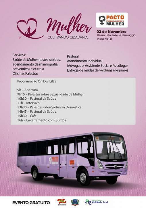 O Bairro São José, em Nova Veneza, irá receber o Ônibus Lilás do programa Mulher Viver Sem Violência, da Secretaria de Estado da Assistência Social, Trabalho e Habitação em parceira com a Secretaria Municipal de Assistência Social, a partir das 9h, desta sexta-feira, dia 3 de novembro.