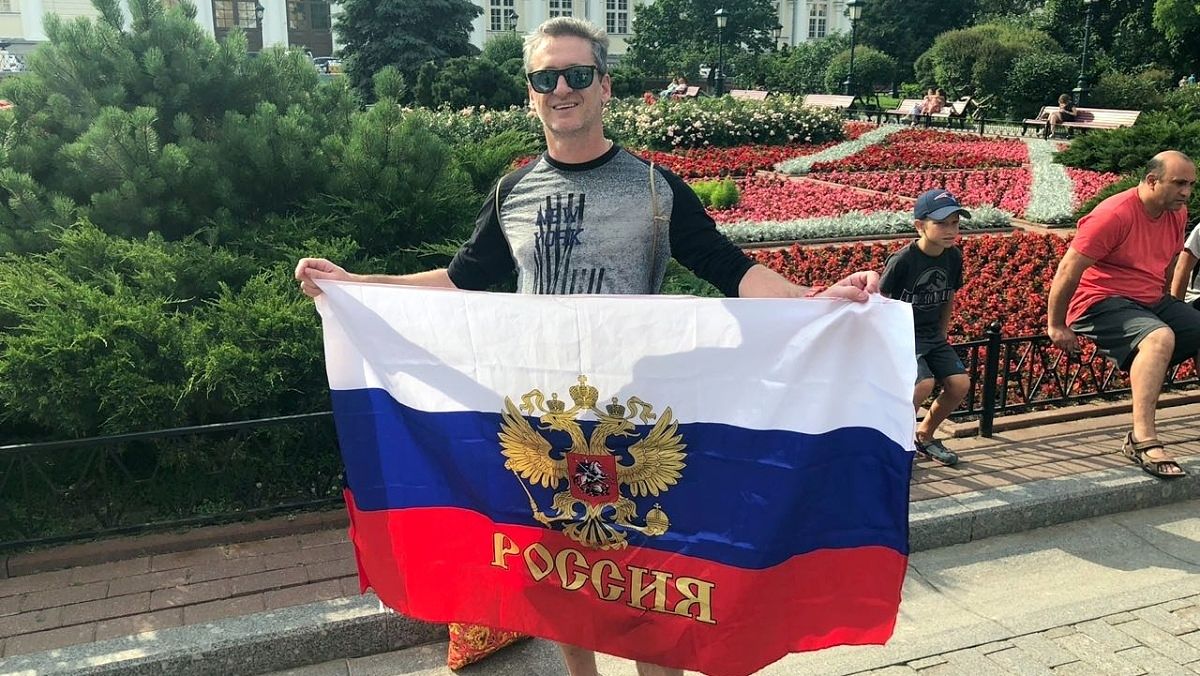 No registro fotográfico o amigo criciumense Thales Guzzatti tendo em suas mãos a bandeira da Rússia que me trouxe diretamente daquele país sede da copa. Obrigado pelo regalo, que agora faz parte da minha coleção de centenas de bandeiras dos quatro cantos do planeta. “Grasie!!!”