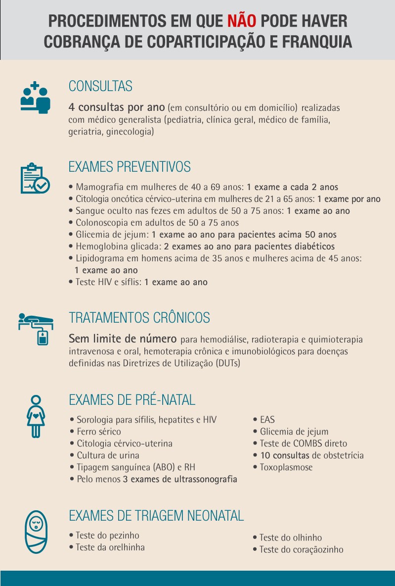As novas regras também preveem isenção de cobrança de coparticipação e franquia em mais de 250 procedimentos e eventos em saúde, tais como: consultas com médico generalista, exames preventivos e de pré-natal e tratamentos crônicos. Atualmente, os mecanismos incidem em qualquer procedimento. Com o estabelecimento de isenções, a ANS busca incentivar o adequado cuidado à saúde. Veja abaixo os procedimentos que não poderão ter cobrança de coparticipação e franquia: