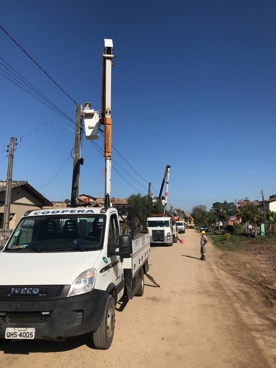 A Cooperativa Pioneira de Eletrificação – Coopera, iniciou esta semana  a primeira etapa de melhoria na rede de distribuição de alta e baixa tensão do Bairro Saturno, em Forquilhinha. O desligamento aconteceu na última terça-feira, 03, onde foram realizados a substituição de postes e cabos de baixa tensão. Também foi instalado um novo