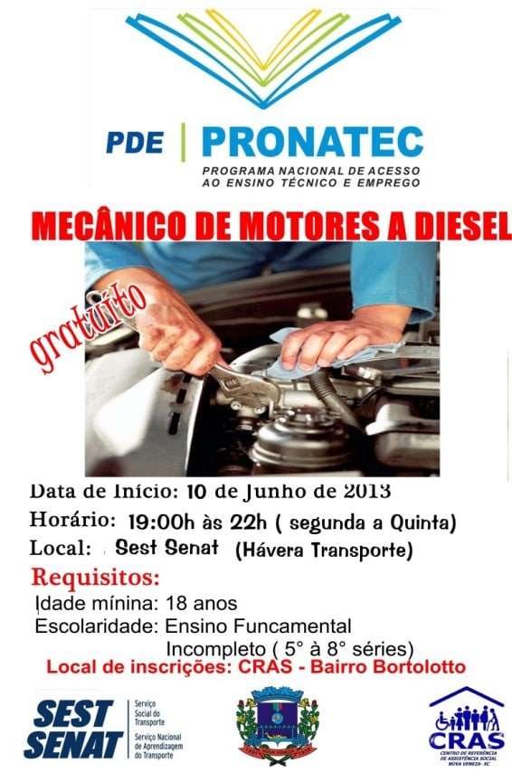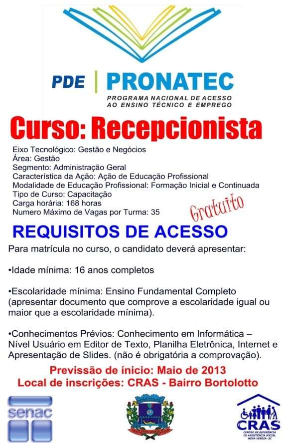 São oferecidos cursos de educação profissional a estudantes, trabalhadores diversos, pessoas com deficiência e beneficiários dos programas federais de transferência de renda. As inscrições para manicure, recepcionista e mecânico de motores a diesel já estão abertas, e podem ser feitas até dois dias antes do inicio do curso, no CRAS. As vagas estão abertas para todos que seguirem os pré-requisitos de cada curso.