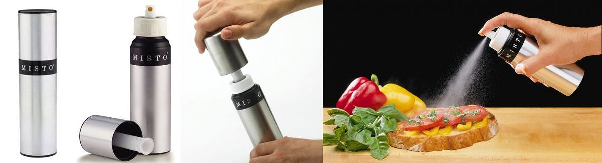 Por razões de economia, uniformidade e para evitar excessos, utilize um pulverizador para aplicação de óleos e azeites nos alimentos (saladas e outros). Existem no mercado vários tipos, destacando-se os de metal (inox) e os mais simples, de plástico.