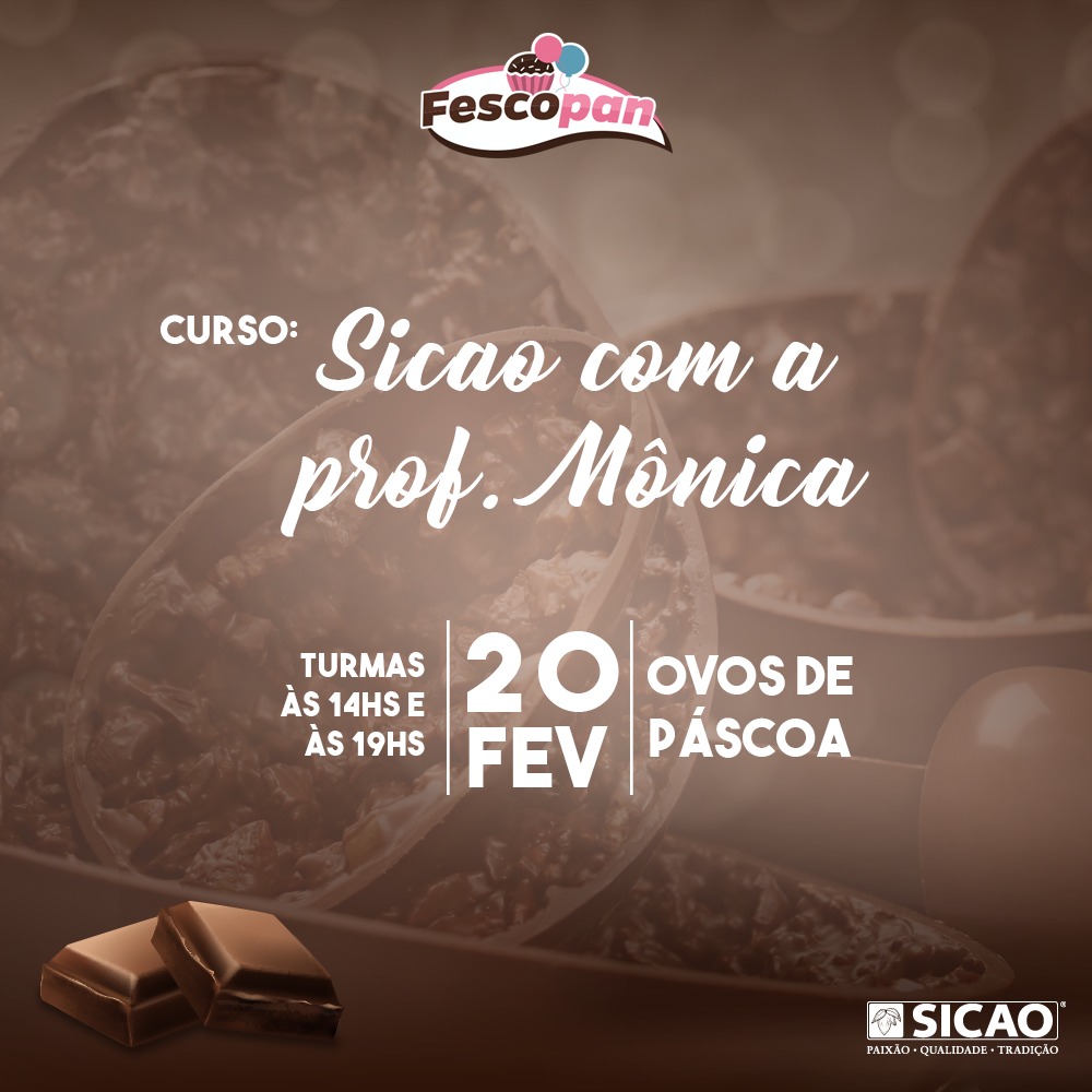 Portanto, a Páscoa está chegando e com ela a COMERCIAL FESCOPAN, em parceria com a SICAO, sempre inovando e trazendo receitas de dar água na boca, promovem o CURSO DE OVOS DE PÁSCOA. Na ocasião, você vai aprender a trabalhar com o delicioso chocolate (callebaut), fazer cascas, recheios, decorações e terá muitas dicas. Em destaque, 3 ovos deliciosos: ovo brullé, ovo com recheio passion fruit e um maravilhoso ovo de corte com ganache e casca trufada.