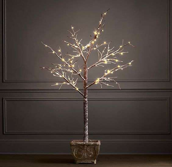 Nesta opção a árvore foi reduzida aos galhos, perdendo todas as folhas! Apenas gravetos foram trabalhados com iluminação em um vaso, e quem pode dizer que não ficou lindo?