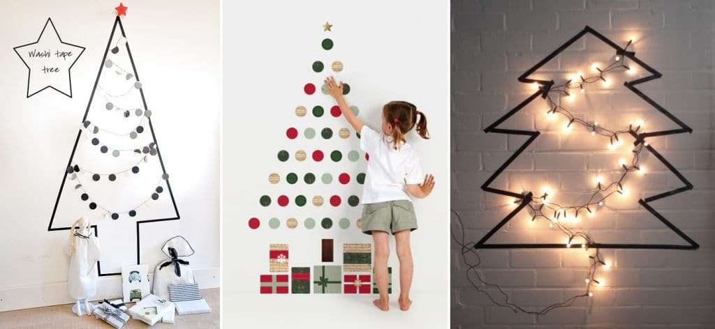 Nestas opções a árvore foi mais reduzida ainda, transformando-se em simples desenhos na parede! Repare que as duas da ponta foram delimitadas com fita isolante e a central com bolas de papel de presente. Ótimo para dar aquela reduzida no orçamento e de quebra ocupar menos espaço.