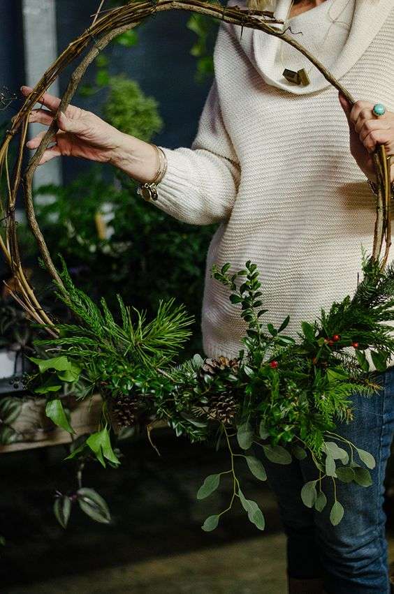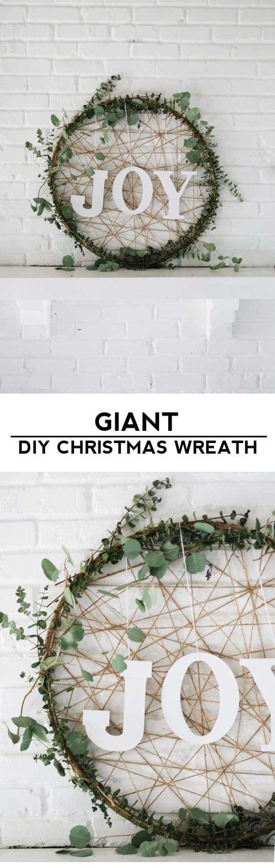 Essa também é composta por galhos secos, porém foi ornada com folhas verdes frescas e teve seu centro transformado em um porta-retratos, por meio do transpassamento de linhas. Nessa guirlanda a palavra “Joy” foi fixada pelas linhas, mas alocar uma foto da família nesse centro, seria uma ideia maravilhosa, não?