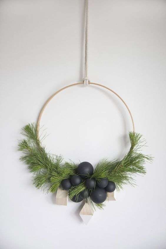 Esta aqui também é bastante atual, e foi toda estilizada, desde o arco, bastante minimalista até a forma de pendurar, com uma corda! Repare nas bolinhas pretas foscas e nos elementos geométricos que compõem o ornamento, muito moderna!