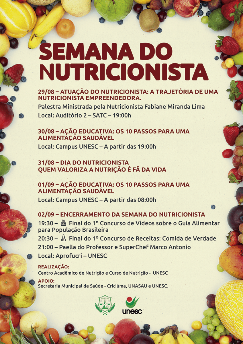 O evento é uma parceria entre o curso de Nutrição, o Centro Acadêmico de Nutrição e a UNA SAU (Unidade Acadêmica de Ciências da Saúde), com o apoio do Conselho Regional de Nutricionistas 10ª Região e Secretaria Municipal de Saúde de Criciúma.