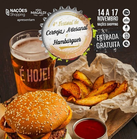 Até sábado, 17, o estacionamento externo do Nações Shopping segue com uma super estrutura montada para o 4º Festival de Cerveja Artesanal e Hambúrguer. O evento, com entrada gratuita, conta com mais de dez opções de food trucks.