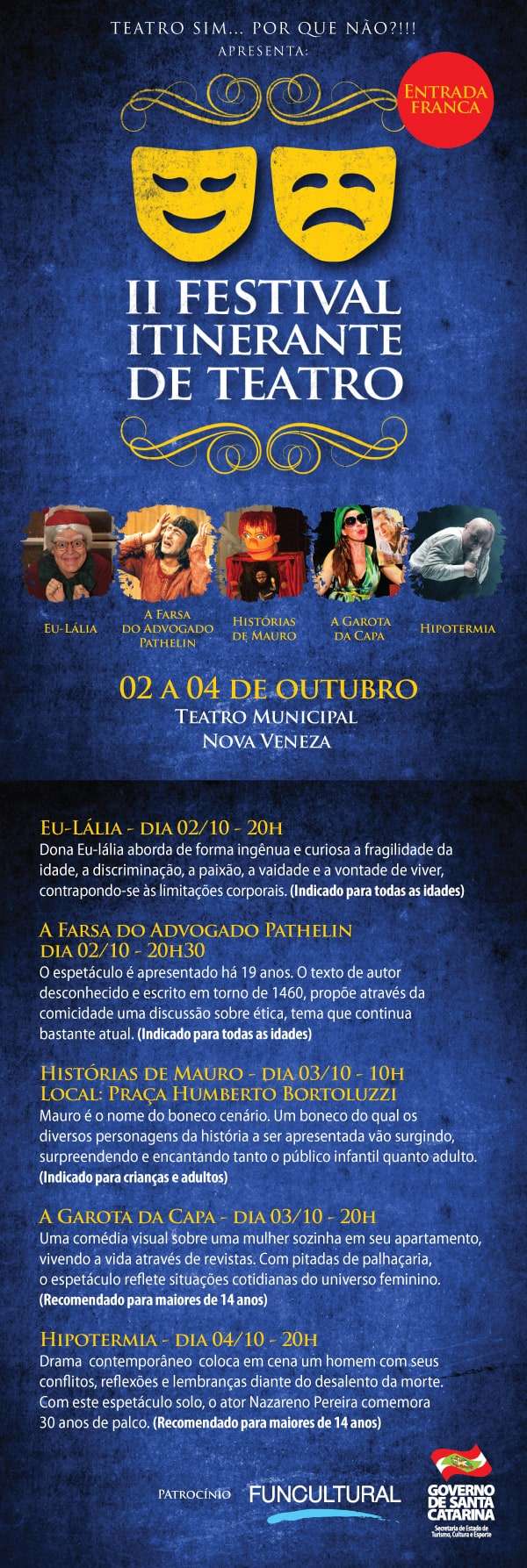 O Grupo Teatro Sim… Por Que Não?!!!, de Florianópolis, realizará a segunda edição do Festival Itinerante de Teatro nas cidades de Nova Veneza, Brusque, São Bento do Sul, Joaçaba e Maravilha, abrangendo todas as regiões do Estado. Todas as apresentações serão com entrada franca e não terão nenhum custo para as cidades selecionadas.
