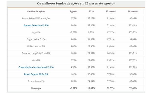 Para investidores com perfil de risco, os fundos de investimentos em ações têm apresentado um excelente desempenho em 2019. Veja na relação a seguir o desempenho dos principais fundos: