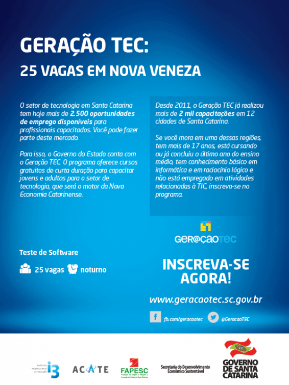 Para suprir a falta de profissionais qualificados no setor de tecnologia, o Geração TEC, programa do Governo do Estado para capacitação de jovens e adultos no setor de Tecnologia da Informação e Comunicação (TIC), abriu novo processo seletivo em Nova Veneza e outras cidades catarinenses. Os interessados podem se inscrever pelo site www.geracaotec.sc.gov.br, até 26 de agosto, às 16h.