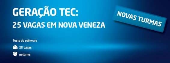 Em Nova Veneza, serão ofertadas 25 vagas para o curso de Teste de Software. A duração será de 160 horas de aula aproximadamente, com previsão de início em setembro, no período noturno. Os cursos foram selecionados conforme a demanda por profissionais de cada município. “Nosso objetivo é incentivar os jovens a buscar uma profissionalização para contribuir na entrada do mercado de trabalho”, explica o prefeito Evandro Gava. O levantamento inicial do mapeamento apontou para uma necessidade de mais de 2,4 mil profissionais neste ano. Para conhecer essa demanda, o Geração TEC mapeou 13 cidades do Estado, durante dois meses.