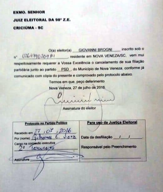 Um dos fundadores da sigla em Nova Veneza, o ex-vereador e ex-presidente do partido, o advogado Giovanni Brogni, assinou na manhã desta quarta-feira, 27, por meio de ofício, sua desfiliação do partido.