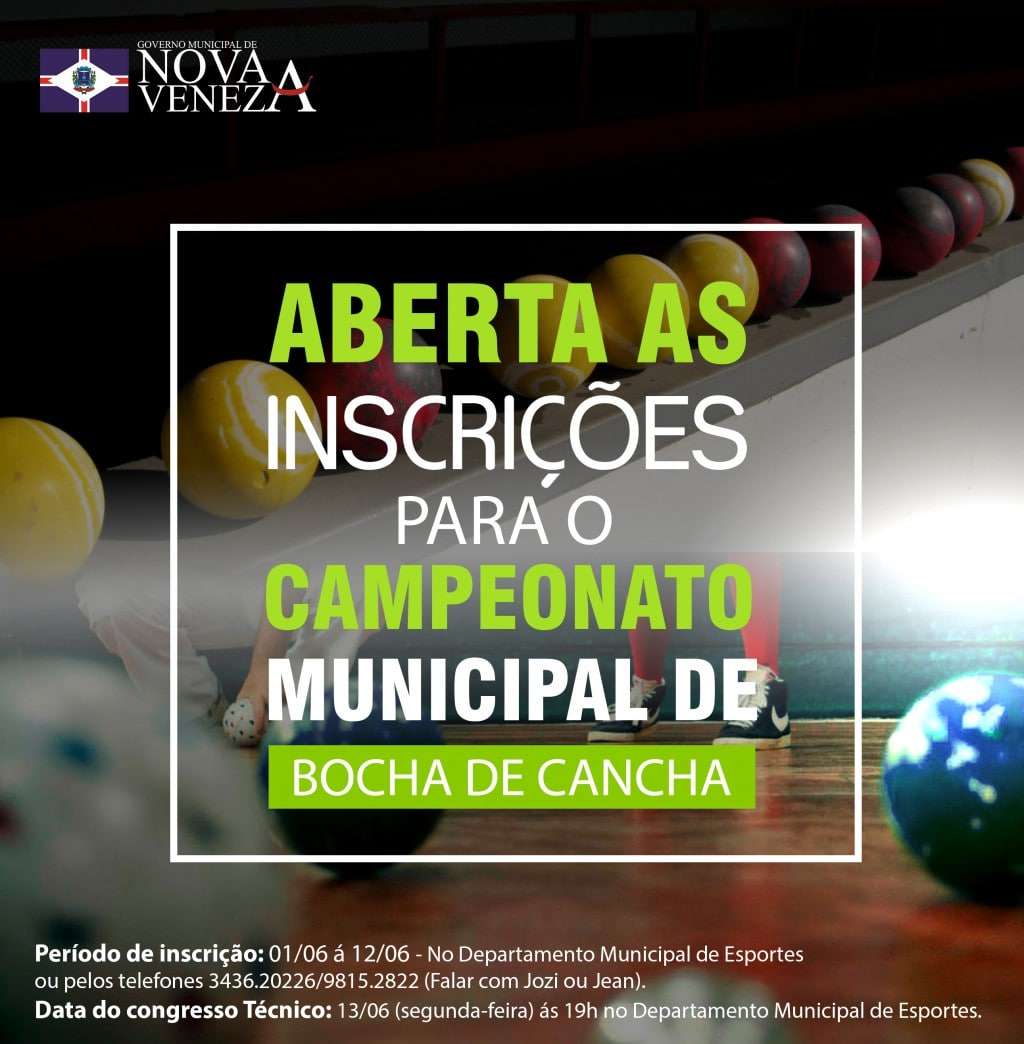 As inscrições para Campeonato Municipal de Bocha de Cancha de Nova Veneza "Taça: Dario Marangoni" estão abertas no período de 01/06 á 12/06. As inscrições são gratuitas! Joziani Trombim