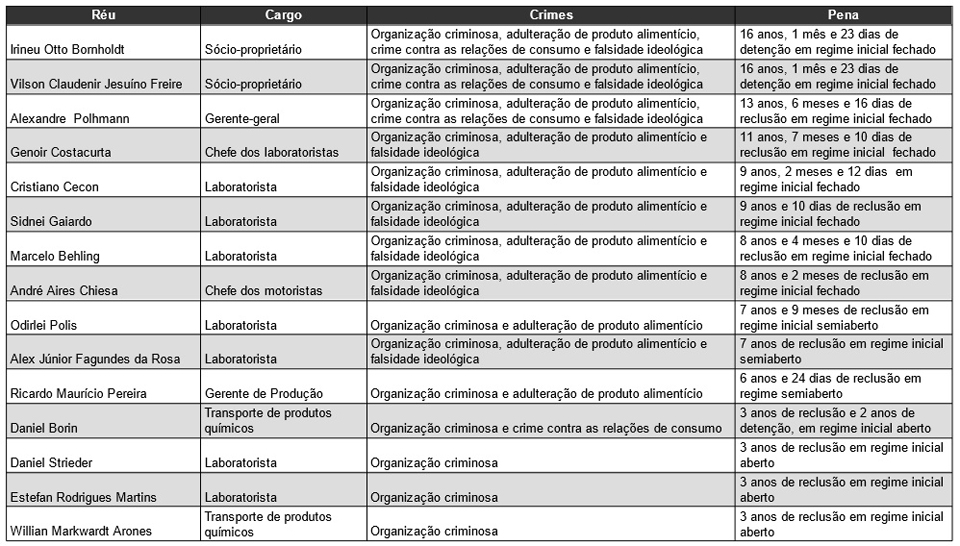 Os 16 réus foram denunciados pela Promotoria de Justiça da Comarca de Mondaí e condenados pelos crimes de organização criminosa, adulteração de alimento, falsidade ideológica ou crimes contra o consumidor, de acordo com a participação de cada um deles. As penas, se somadas, ultrapassam os 125 anos de prisão. As maiores penas foram aplicadas aos chefes da organização e sócios-proprietários da empresa: 16 anos e um mês de reclusão em regime inicial fechado para cada um.