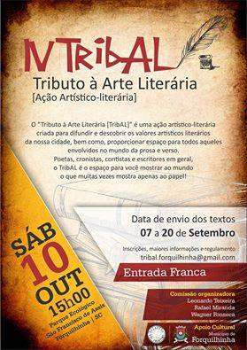 Acontecerá no dia 10 de outubro, a partir das 15:00 horas no parque ecológico São Francisco de Assis em Forquilhinha a IV edição do Tribal – Tributo à Arte Literária, que promete movimentar escritores, apreciadores e a cultura da região.