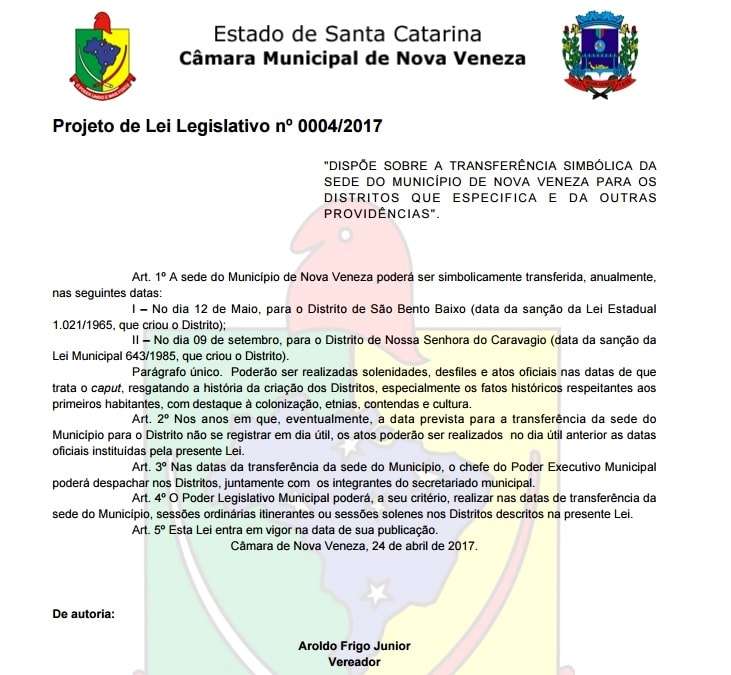 Durante os aniversários dos distritos de Nova Veneza a sede do município poderá ser transferida simbolicamente para os distritos de São Bento Baixo no dia 12 de maio e Nossa Senhora de Caravaggio no dia 9 de setembro, conforme o projeto de lei criado pelo vereador Aroldo Frigo Júnior. O projeto possibilita que o prefeito realize atendimentos e eventos na prefeitura distrital e a Câmara de Vereadores realize a sessão ordinária itinerante.