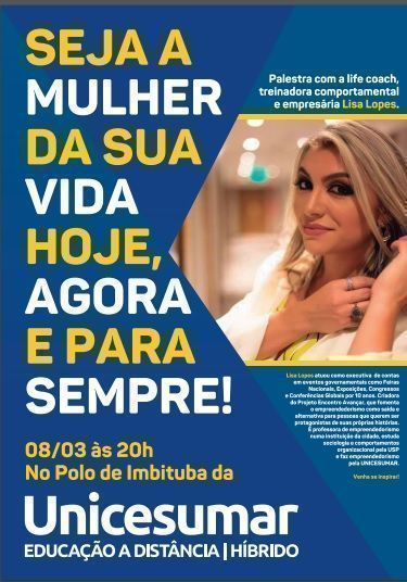 Comemorado pelas Nações unidas (ONU) desde 1975, o Dia Internacional da Mulher transforma a conquista feminina em medidas concretas de empoderamento de mulheres em todos os ambientes. Para celebrar a data e as vitórias alcançadas em mais de 40 anos de luta, a Unicesumar oferece a palestra “Seja a mulher da sua vida hoje, agora e para sempre” com a life coach, treinadora comportamental e empresária, Lisa Lopes.