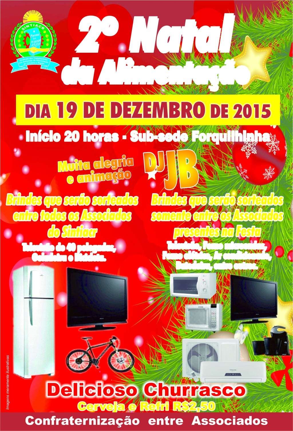 O 2º Natal da Alimentação irá reunir os associados, direção e funcionários em uma festa de confraternização pelas lutas e vitórias conquistadas nesse ano. O evento acontece dia 19 de dezembro, às 20h, na sede do Sindicato dos Trabalhadores nas Indústrias da Alimentação de Criciúma e Região (Sintiacr) em Forquilhinha. Com animação do DJ JB será servido um delicioso churrasco e sorteado diversos prêmios.