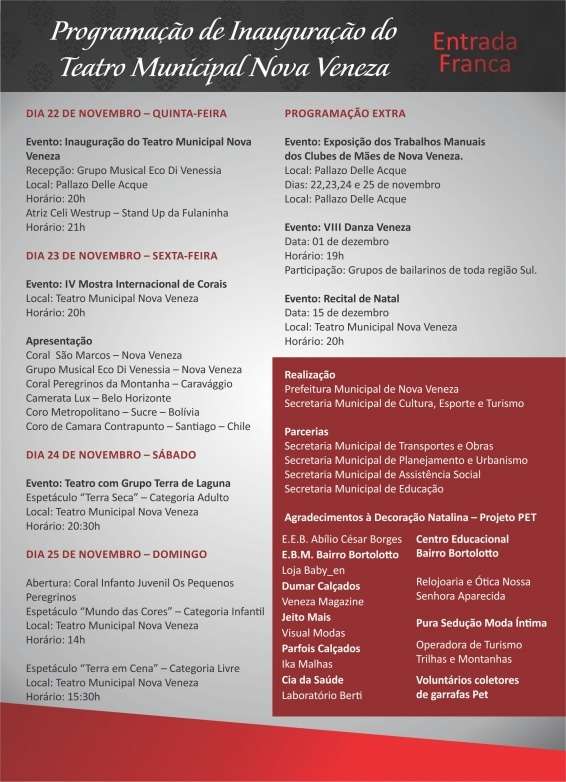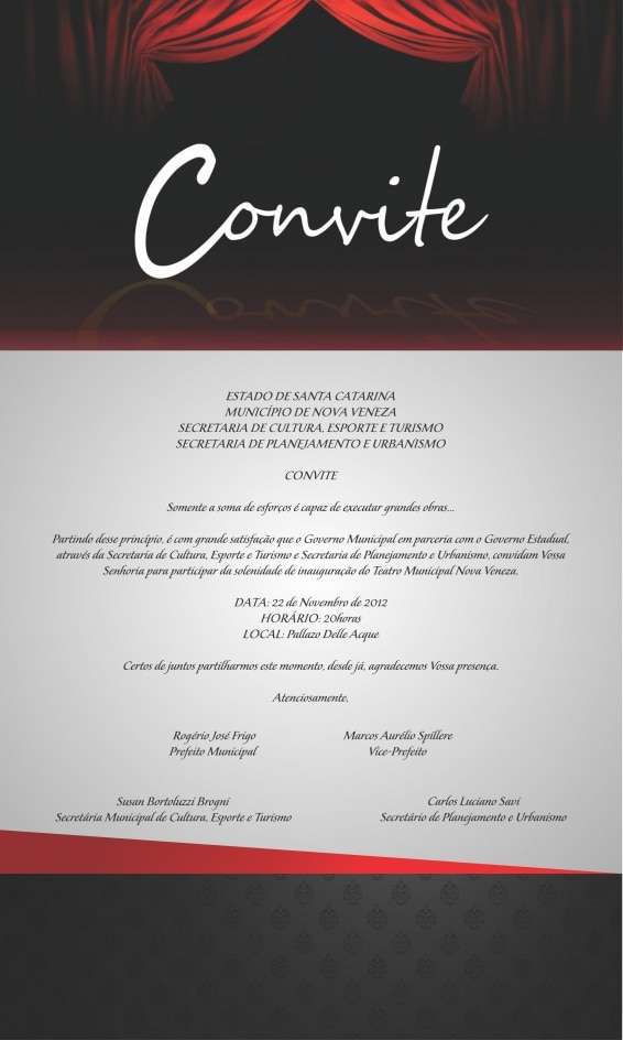 A Secretaria de Cultura, Esporte e Turismo de Nova Veneza, convida para inauguração do Teatro Municipal Nova Veneza que acontecerá dia 22 de novembro de 2012 às 20h.