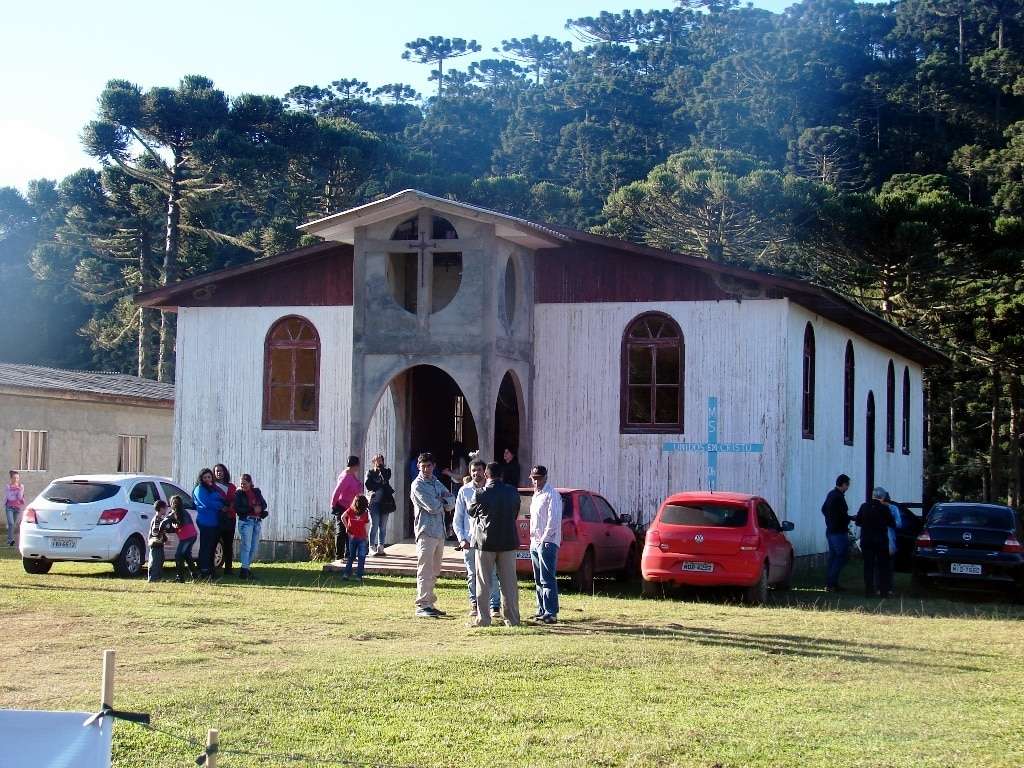 Tarde de missa na igreja da Várzea (RS) que reúne boa parte da população local. No salão havia uma roleta e reuniu um grupo de moradores. Um dos brindes era uma torta ao som do Grupo Cordiona e Porca Veia que vinha de uma caixa de música daquela que aciona com moeda.